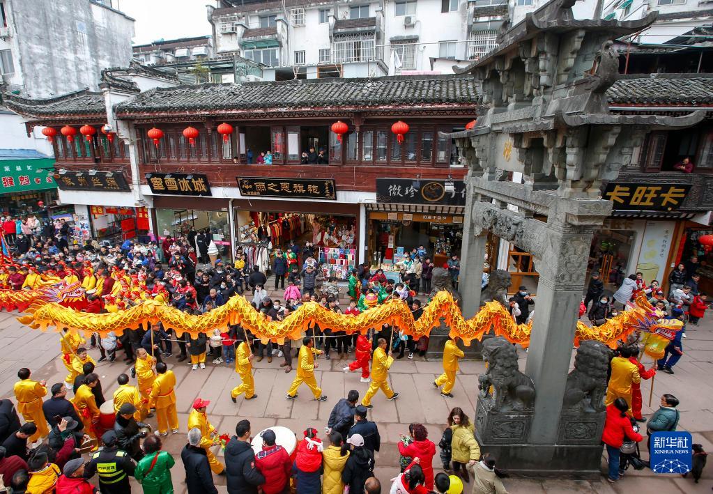 2月15日,在安徽黃山,民俗表演隊伍在屯溪老街進行踩街表演。