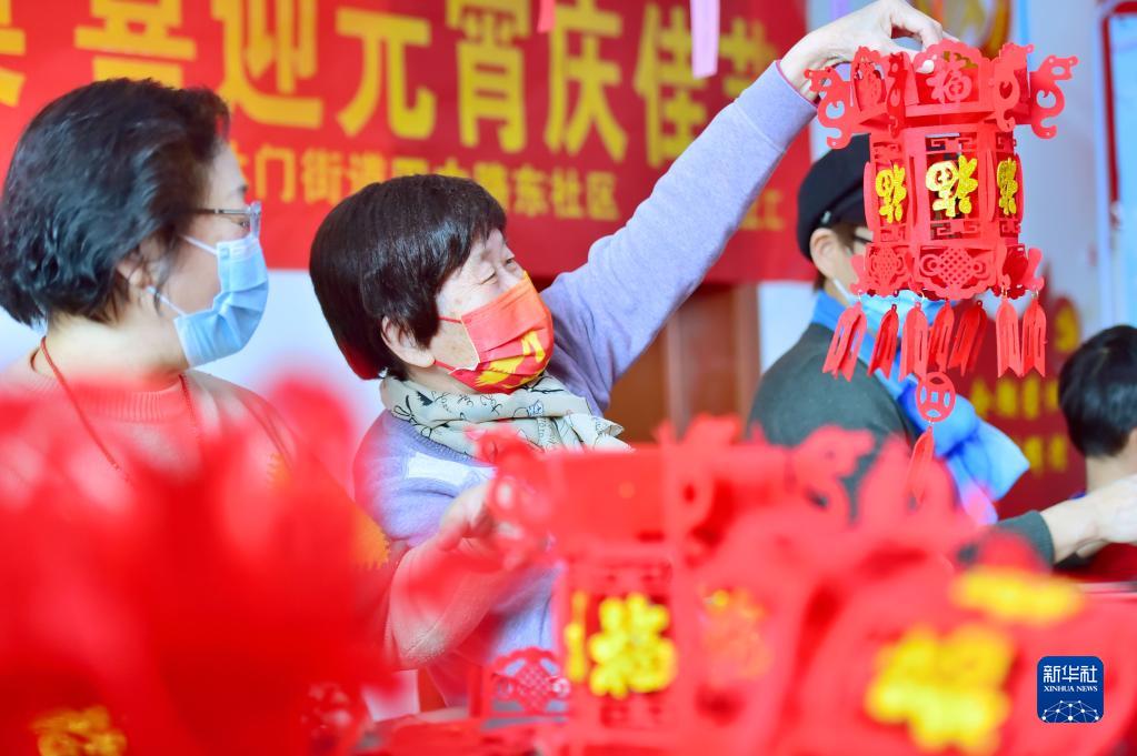 2月14日,在河北省石家莊市橋西區休門街道四中路東社區,社區居民一起制作“?!弊只?。