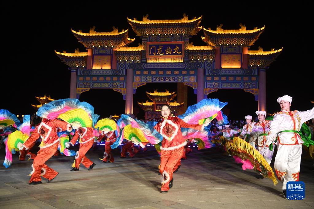2月14日,演員在進行秧歌表演。元宵節期間,寧夏鹽池縣開展龍門祈福游九曲系列元宵節民俗文化活動,吸引眾多百姓前來參觀體驗。