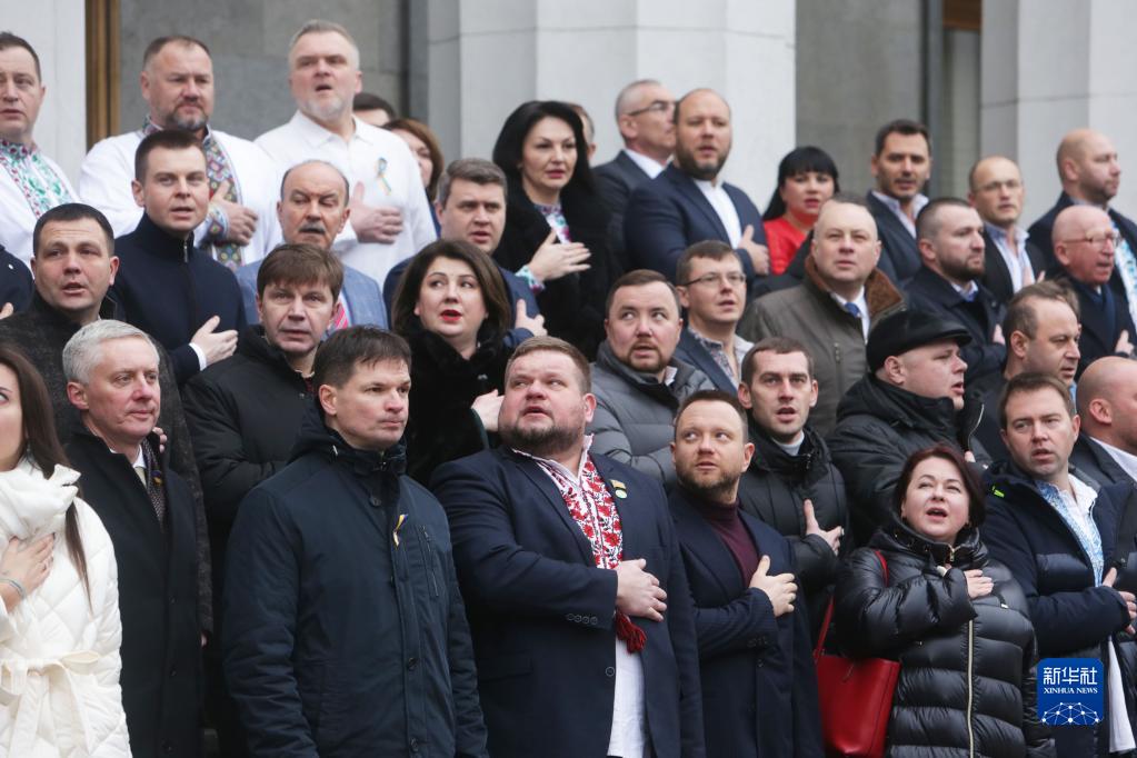2月16日,在烏克蘭首都基輔,議員們在最高拉達(議會)門前的憲法廣場參加團結日慶?;顒?。