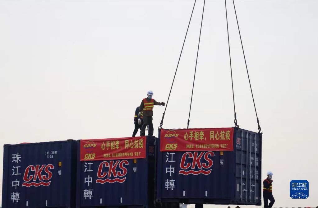 2月18日,工人把供港蔬菜的貨箱裝載到輪船上。新華社發