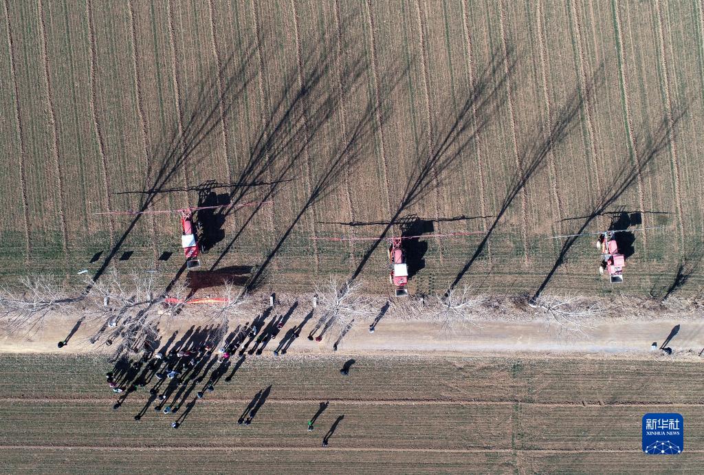 2月21日,在河北省石家莊市鹿泉區山尹村鎮麥田,農業專家給當地農民開展田間授課(無人機照片)。
