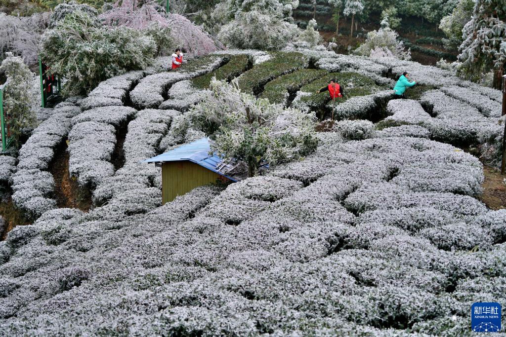 2月21日,在廣西金秀瑤族自治縣金秀鎮六段村,黨員志愿者和村民清理茶樹上的冰雪。