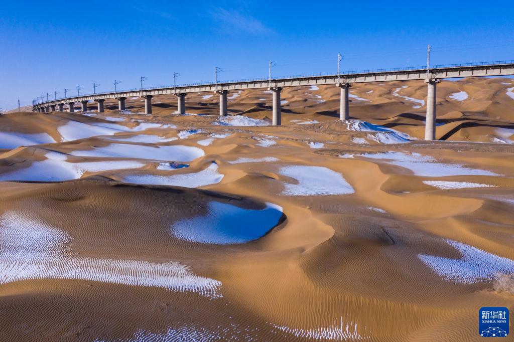 2月21日拍攝的甘肅省酒泉市阿克塞哈薩克族自治縣境內的庫木塔格沙漠雪景(無人機照片)。