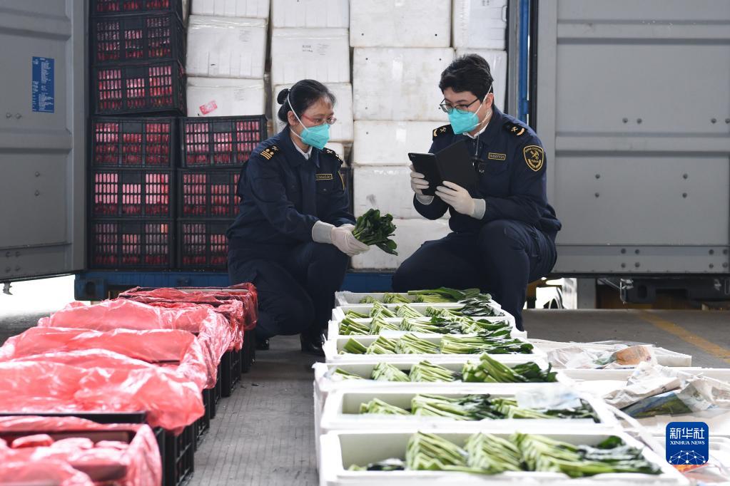 2月21日,在深圳大鏟灣碼頭,深圳海關工作人員查驗供港蔬菜。