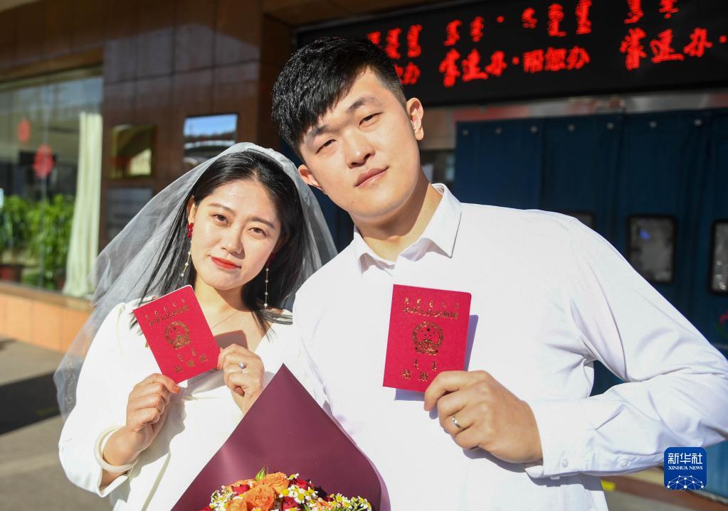 2月22日,新人在內蒙古呼和浩特市回民區市民服務中心門前合影留念。