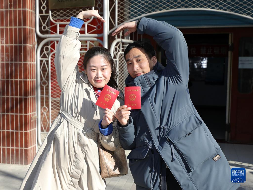 2月22日,在衡水市桃城區民政局婚姻登記處,新人展示剛剛領取到的結婚證。