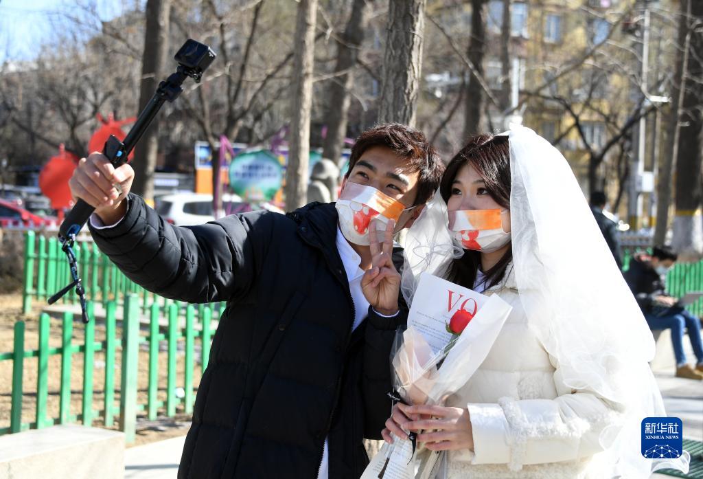 2月22日,在北京市海淀區民政局婚姻登記處外,一對新人在等待領取結婚證時自拍留念。