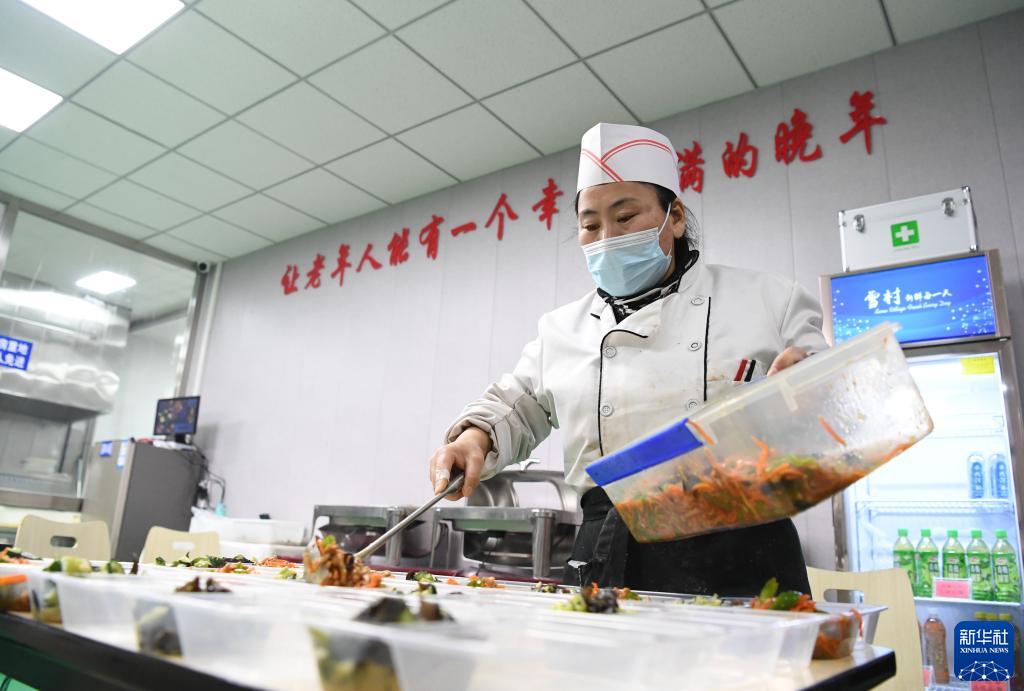 河北省承德市濱河社區老年食堂工作人員在為老人配餐(2021年12月16日攝)。