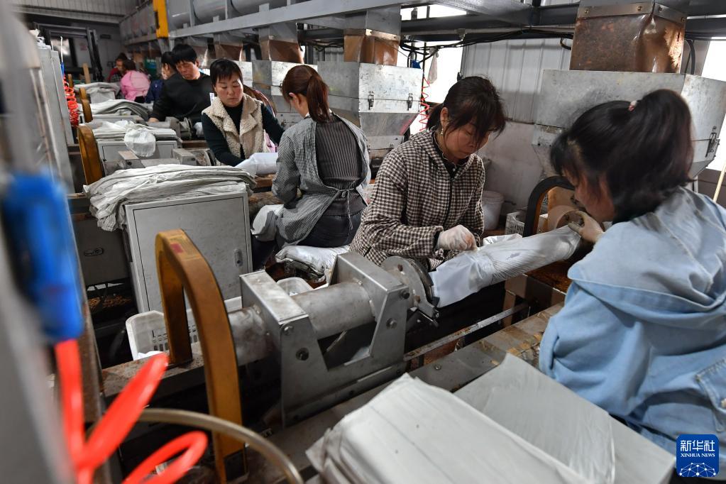 2月23日,工作人員在萬榮縣香菇產業園內加工菌棒。