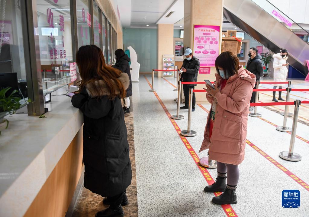 2月23日,在呼和浩特市婦幼保健院門診樓內,就診人員在一米線外排隊等候。