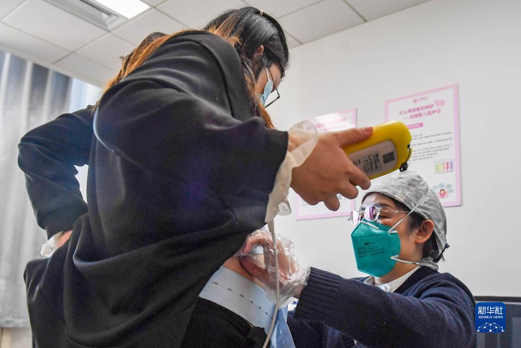 2月23日,在呼和浩特市婦幼保健院婦產科內,醫務人員準備為孕婦做胎心監測。