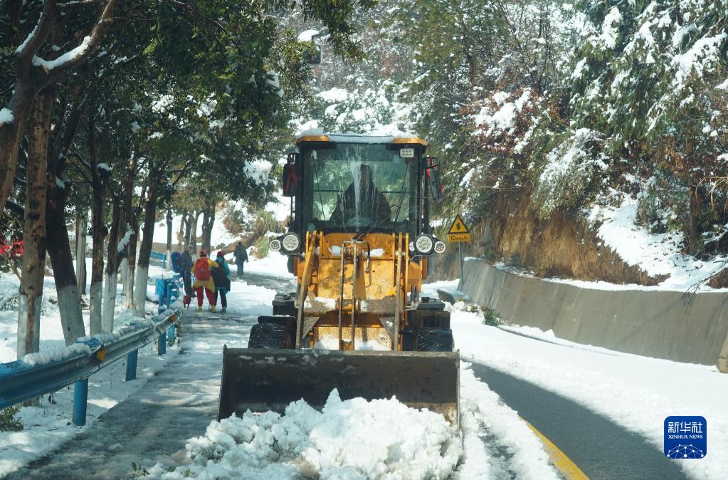 2月23日,江西省南昌市灣里管理局洗藥湖管理處的工作人員用鏟車清除路面積雪,保障道路暢通。