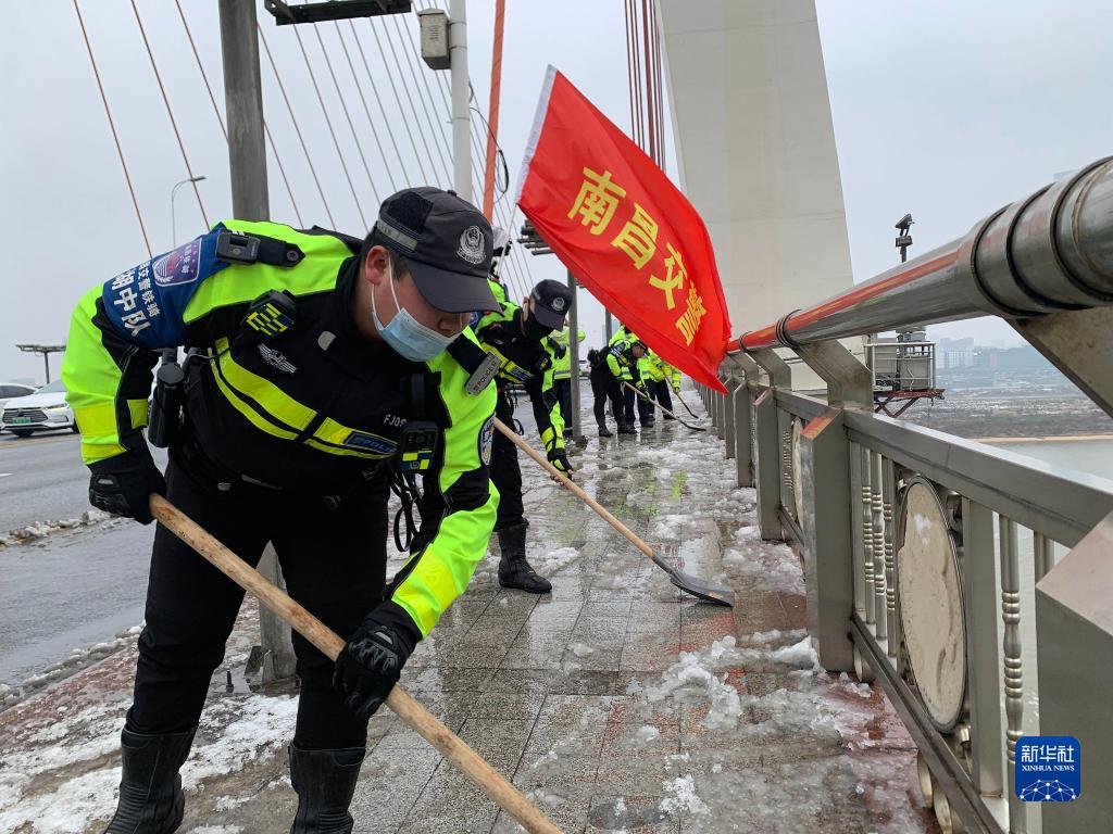 2月23日,江西省南昌市東湖區交警在八一大橋掃雪除冰。