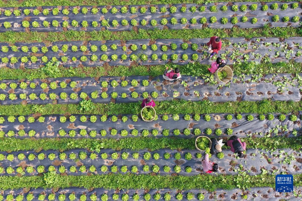 2月23日,在四川省眉山市中法農業科技園蔬菜種植基地,農民在采收蔬菜(無人機照片)。