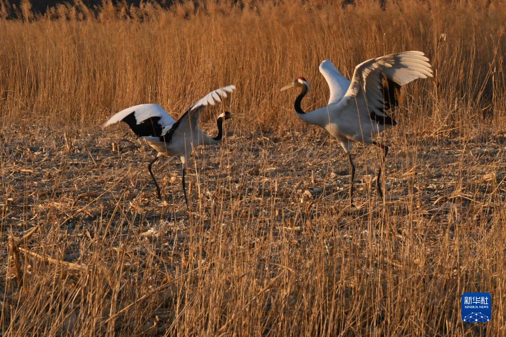 2月23日,兩只國家一級保護動物丹頂鶴在山西省大同市廣靈縣壺流河濕地駐足棲息。新華社記者 馬毅敏 攝