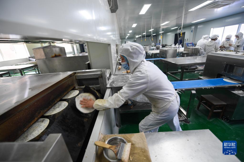 2月24日,在杭州市淳安縣臨岐鎮秋念餅業工廠,工人在半自動流水線上制作當地特色美食——梅干菜餅。該廠日產梅干菜餅約20000個,招收員工200余人,不少當地百姓實現在家門口就業創收。