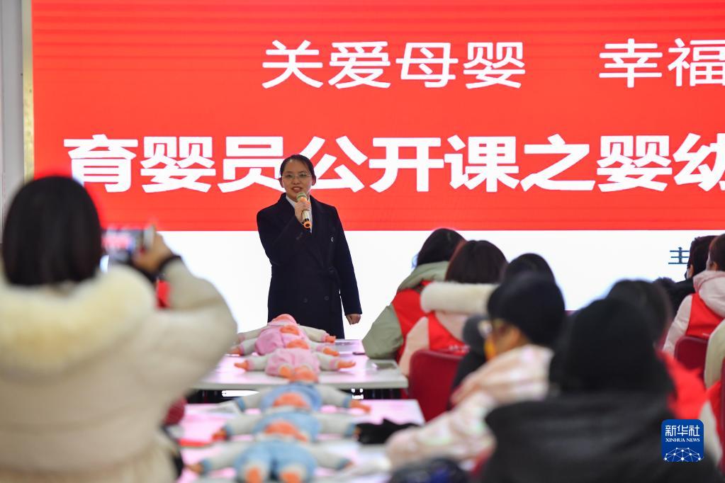 2月24日,在湘潭市雨湖區人力資源和社會保障服務中心,老師在育嬰員培訓班上為學員講解育嬰知識。