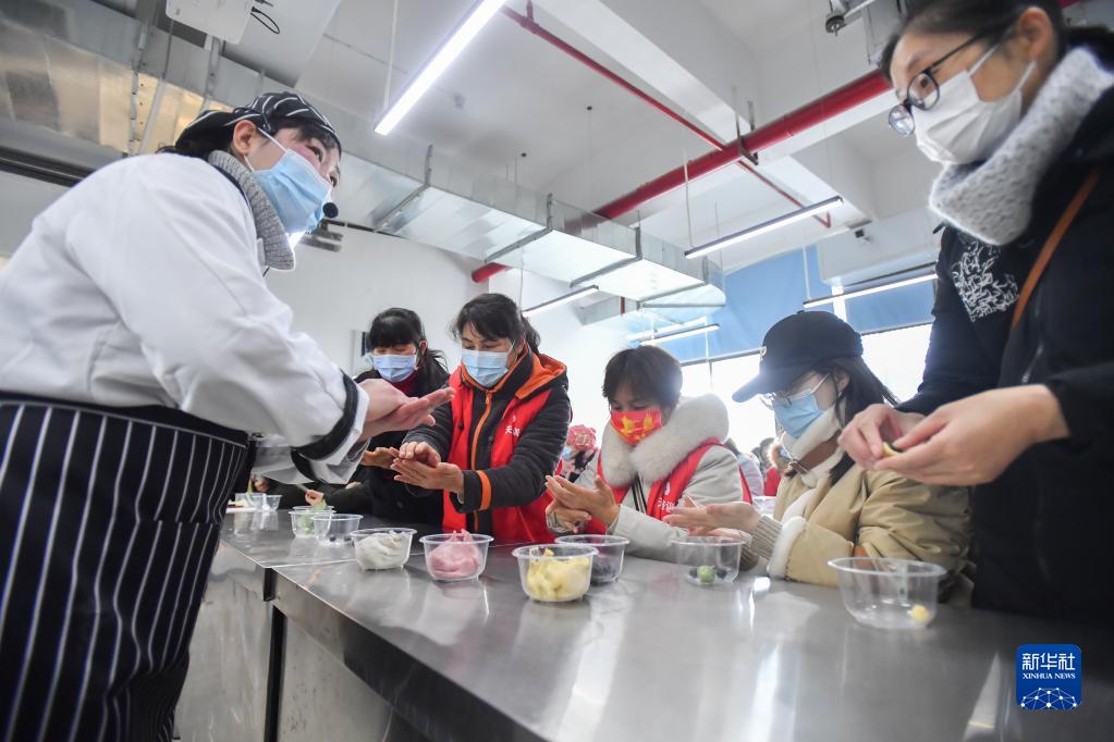 2月24日,在湘潭市雨湖區人力資源和社會保障服務中心,老師(左一)在面點師培訓班上教學員制作湯圓。