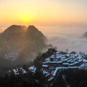 2月24日早上拍攝的湖南省湘西土家族苗族自治州花垣縣雙龍鎮十八洞村雪后日出(無人機照片)。