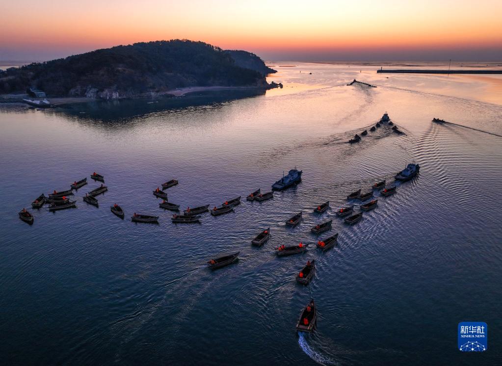 2月24日,在山東省榮成市俚島鎮俚島灣海域,漁民們駕駛著漁船、舢舨迎著朝陽出海作業(無人機照片)。