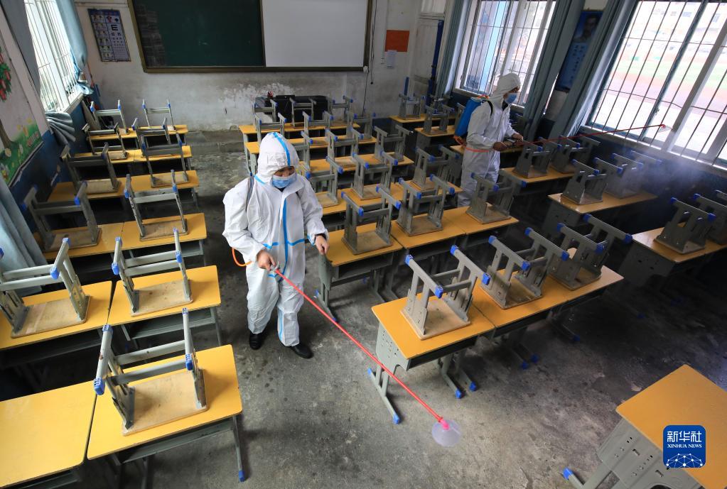 2月26日,在貴州省從江縣剛邊鄉中心小學,工作人員在教室內消殺。