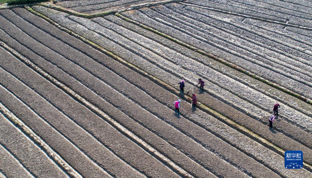 2月27日,湖南省懷化市通道侗族自治縣菁蕪洲鎮江口村村民在整理田地(無人機照片)。