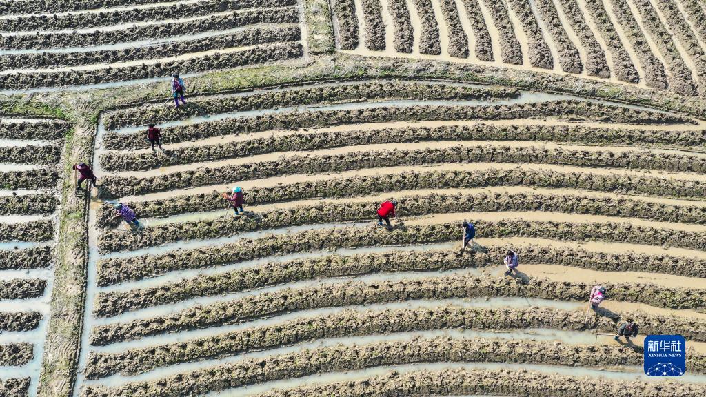 2月27日,湖南省衡陽市常寧市西嶺鎮石江村村民在田間勞作(無人機照片)。