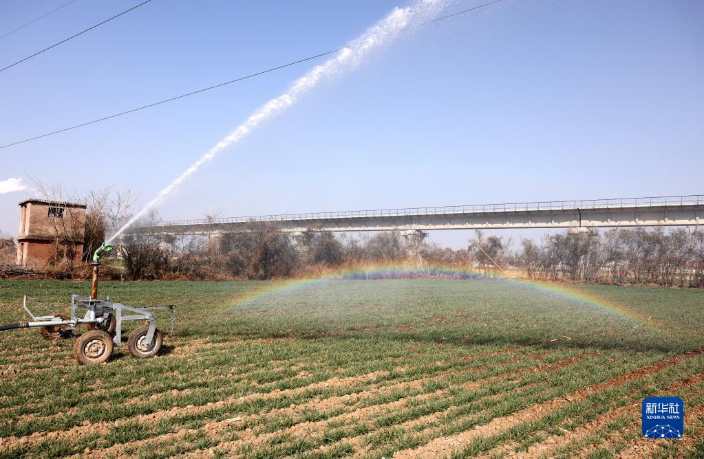 2月27日,山東省棗莊市市中區一種植專業合作社的農民利用卷盤式噴灌機為小麥澆返青水。