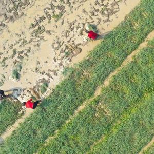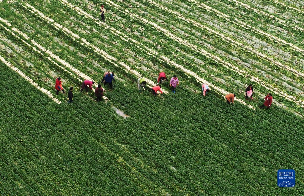 2月28日,在四川省南充市蓬安縣錦屏鎮中壩社區,村民在地里勞作(無人機照片)。