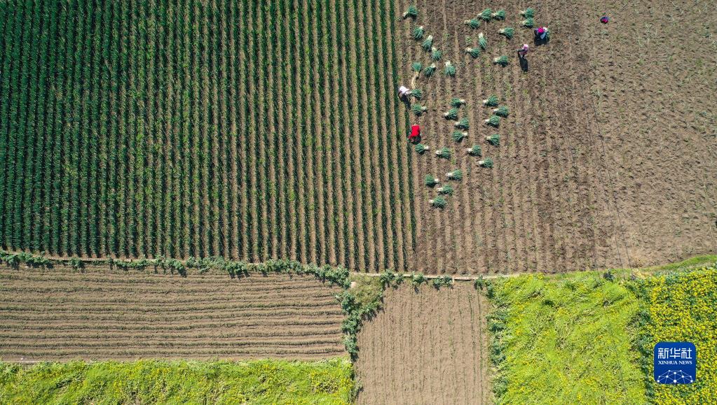 2月28日,在貴州省黔西南布依族苗族自治州興義市萬福村,農民在田間勞作(無人機照片)。