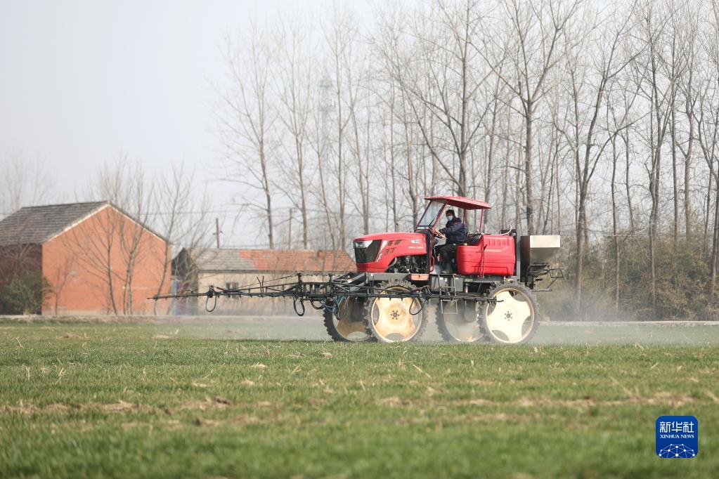2月28日,在江蘇省淮安市洪澤區東雙溝鎮,農民駕駛農機對麥田進行管護。