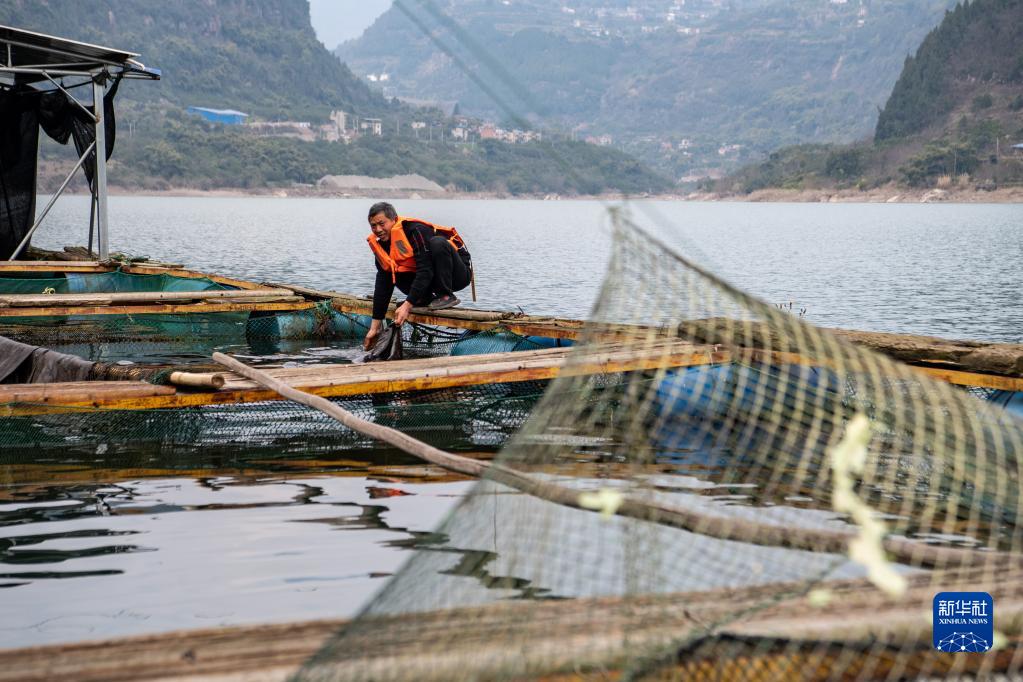 2月25日,三峽庫區珍稀魚類馴養基地工作人員在查看長江鱘的生長情況。