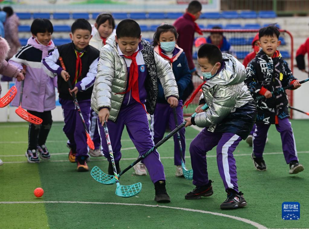 3月1日,西寧市城西區文匯小學學生在校園里體驗旱地冰球。
