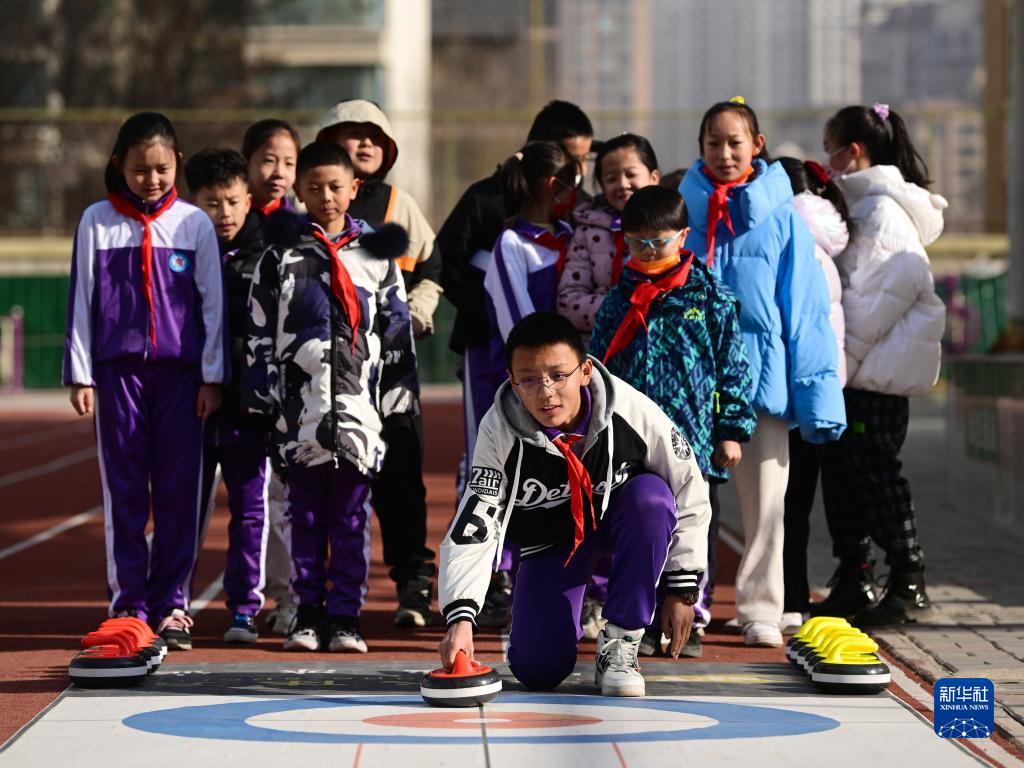 3月1日,西寧市城西區文匯小學學生在校園里體驗旱地冰壺。