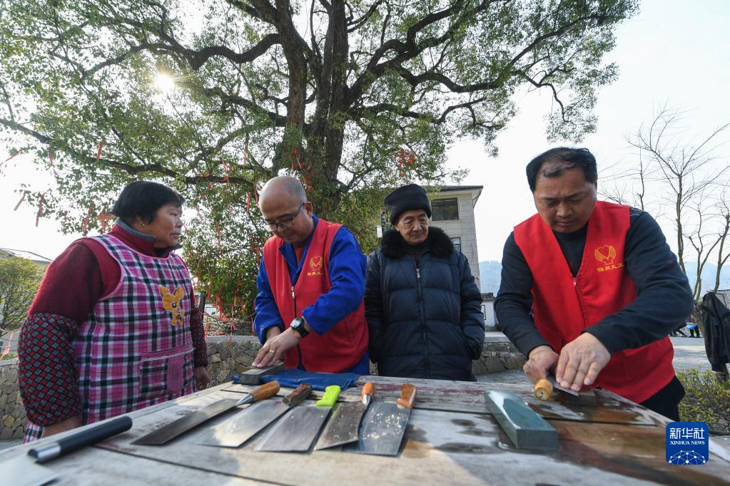 3月1日,昌化鎮“有禮昌化”流動志愿服務站的志愿者在給白牛村的村民們提供磨刀剪服務。
