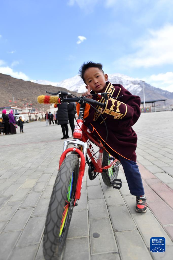 一位搬遷牧民家的孩子在榮瑪高海拔生態搬遷點騎自行車玩耍(2月28日攝)。