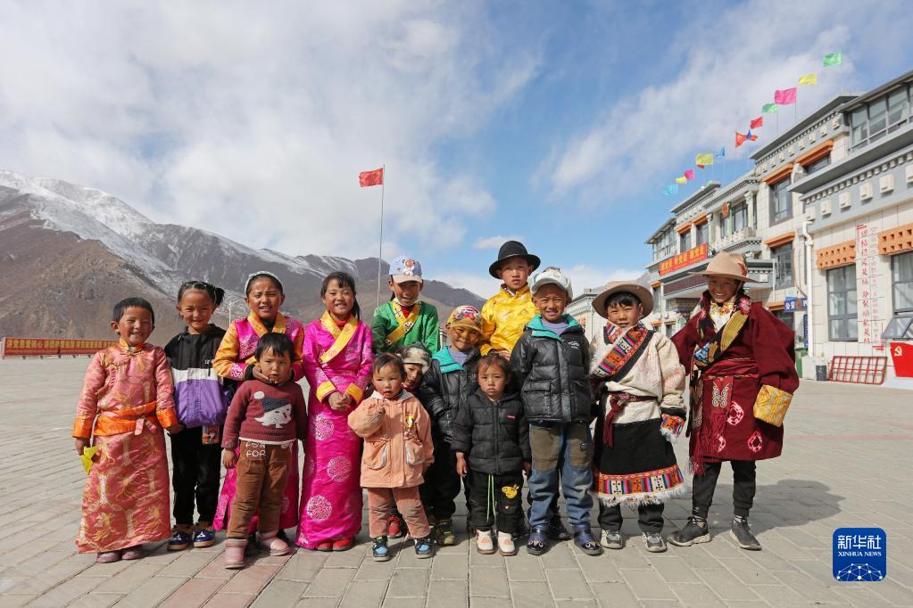 部分搬遷牧民家的孩子在搬遷點廣場上合影,他們當中大一點的出生在榮瑪,最小的幾個出生在古榮(2月28日攝)。