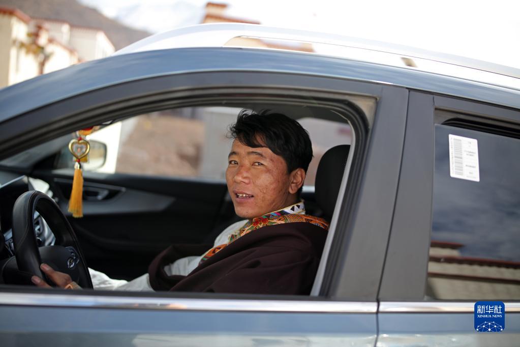 搬遷牧民叢美開著自己新買的汽車(2月28日攝)。