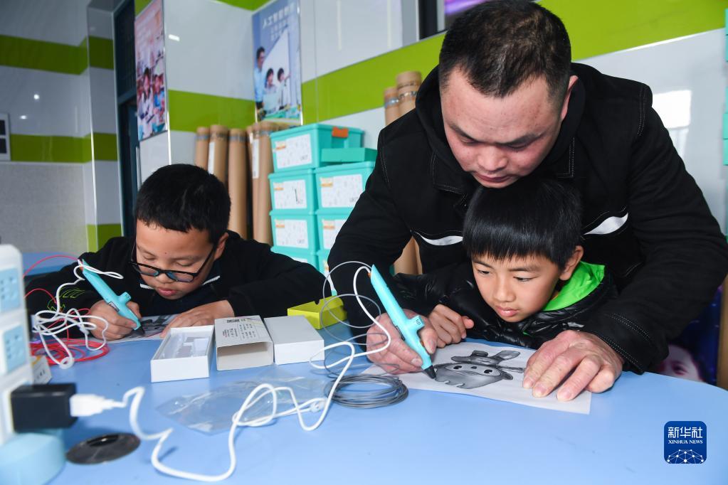 3月1日,杭州市臨安區科學技術協會工作人員在城北小學指導學生使用3D打印筆繪制立體圖案。