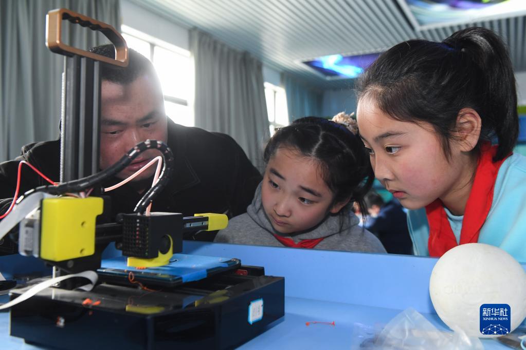 3月1日,杭州市臨安區科學技術協會工作人員在城北小學向學生介紹一臺3D打印機的工作原理。