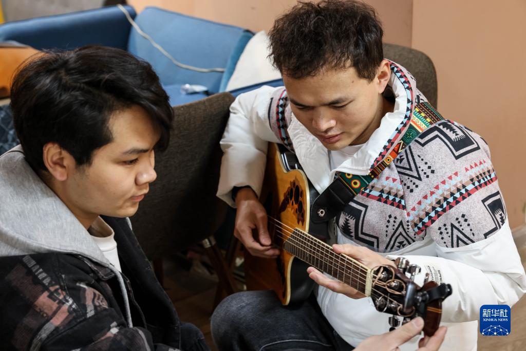 3月1日,“折耳根”樂隊貝斯手彭萬海(左)在幫助吉他手楊志調音。