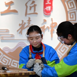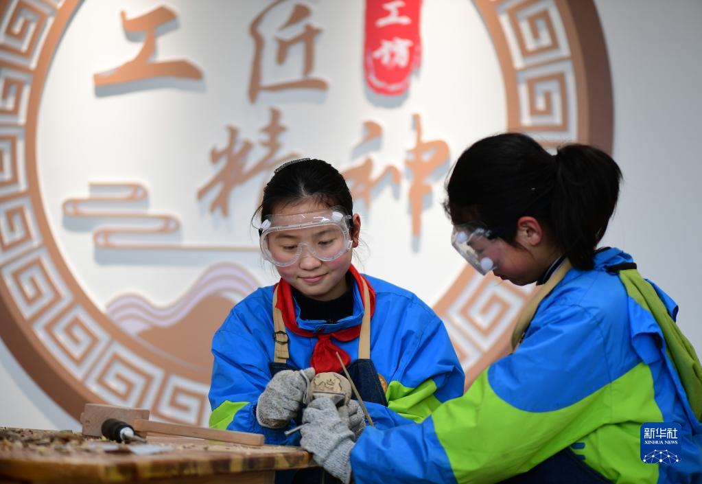 3月2日,在肥西縣嚴店中心學校少年宮,學生在木工坊里體驗學習。