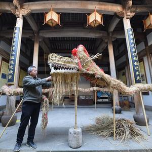 3月2日,在黃山市徽州區蜀源村,村民檢查編織完成的“草龍”。