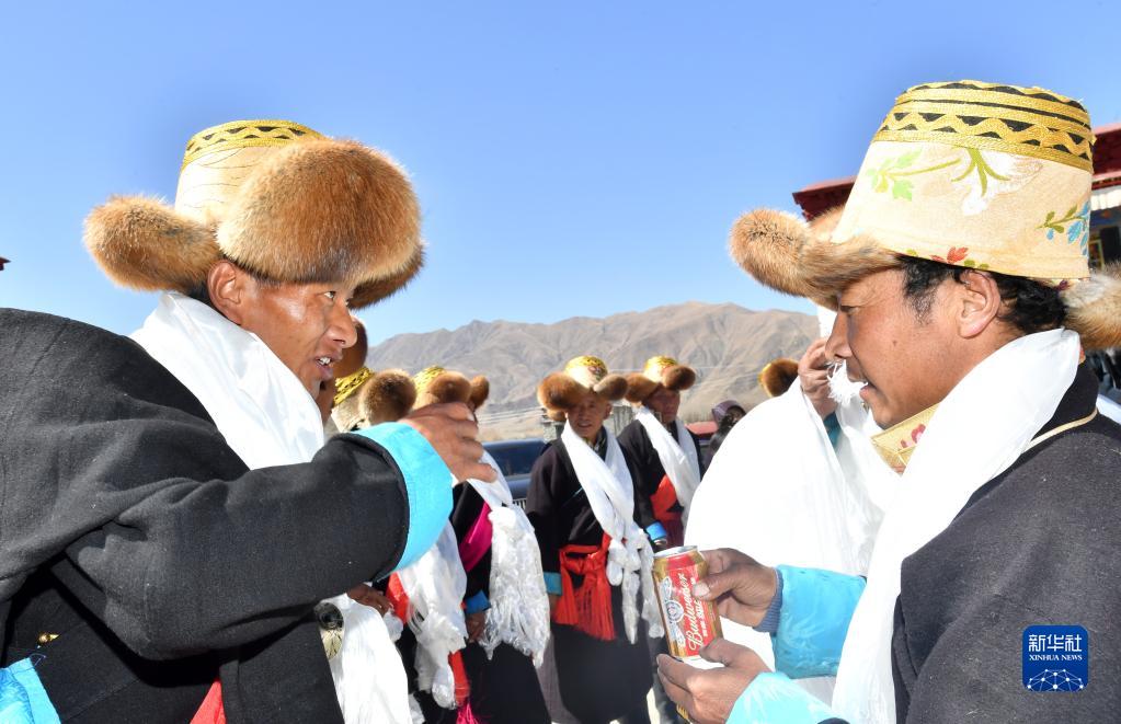 3月3日,西藏山南市貢嘎縣崗堆鎮農民互相敬酒,慶賀藏歷水虎新年。