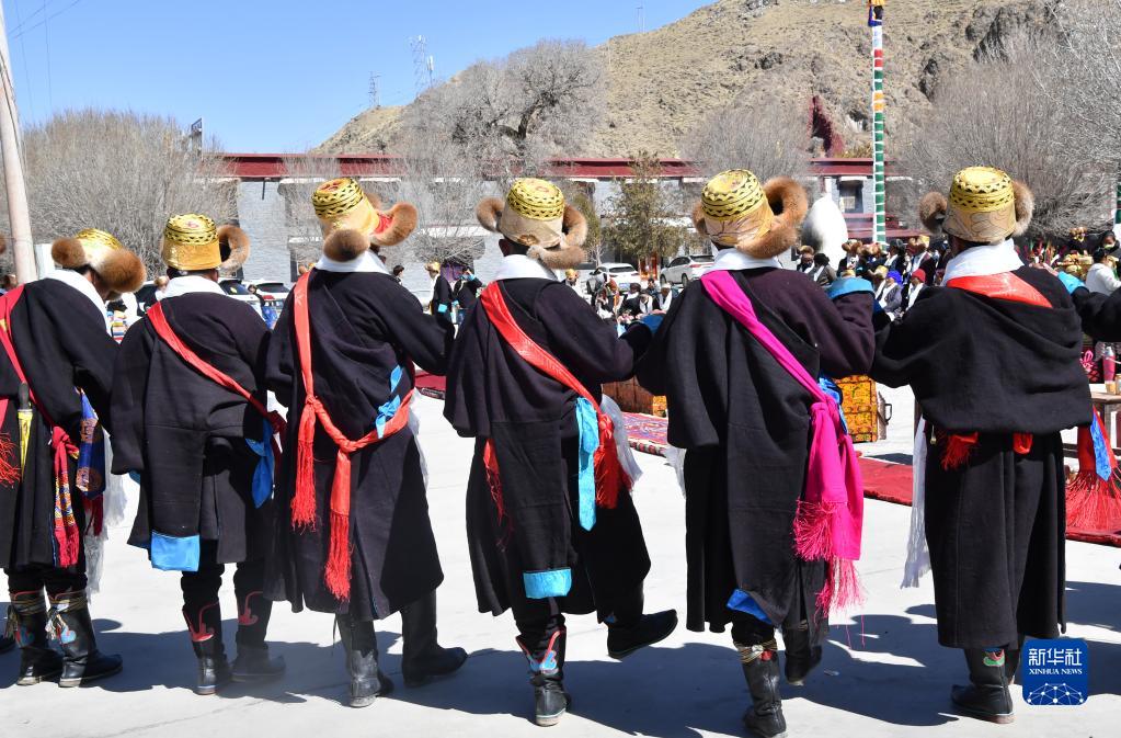 3月3日,西藏山南市貢嘎縣崗堆鎮農民穿著嶄新的氆氌藏裝參加藏歷新年活動。