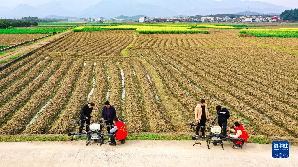 3月3日,在湖南省衡陽市常寧市西嶺鎮桐江村,志愿者在指導種田大戶使用植保無人機(無人機照片)。