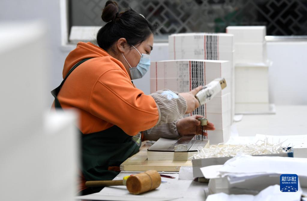 3月3日,工人在涇縣丁家橋鎮一家宣紙企業內制作宣紙線裝書。