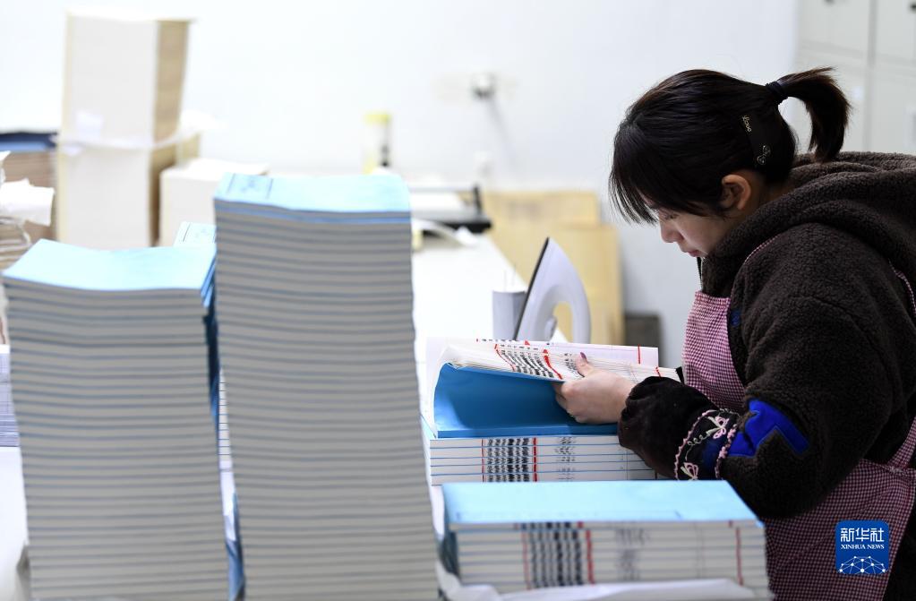 3月3日,工人在涇縣丁家橋鎮一家宣紙企業內制作宣紙線裝書。