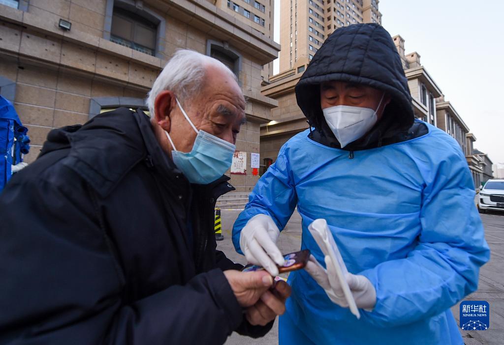 3月4日清晨,在呼和浩特市回民區攸攸板鎮賽馬場北路社區某核酸采樣點,工作人員為群眾發放采樣標簽。